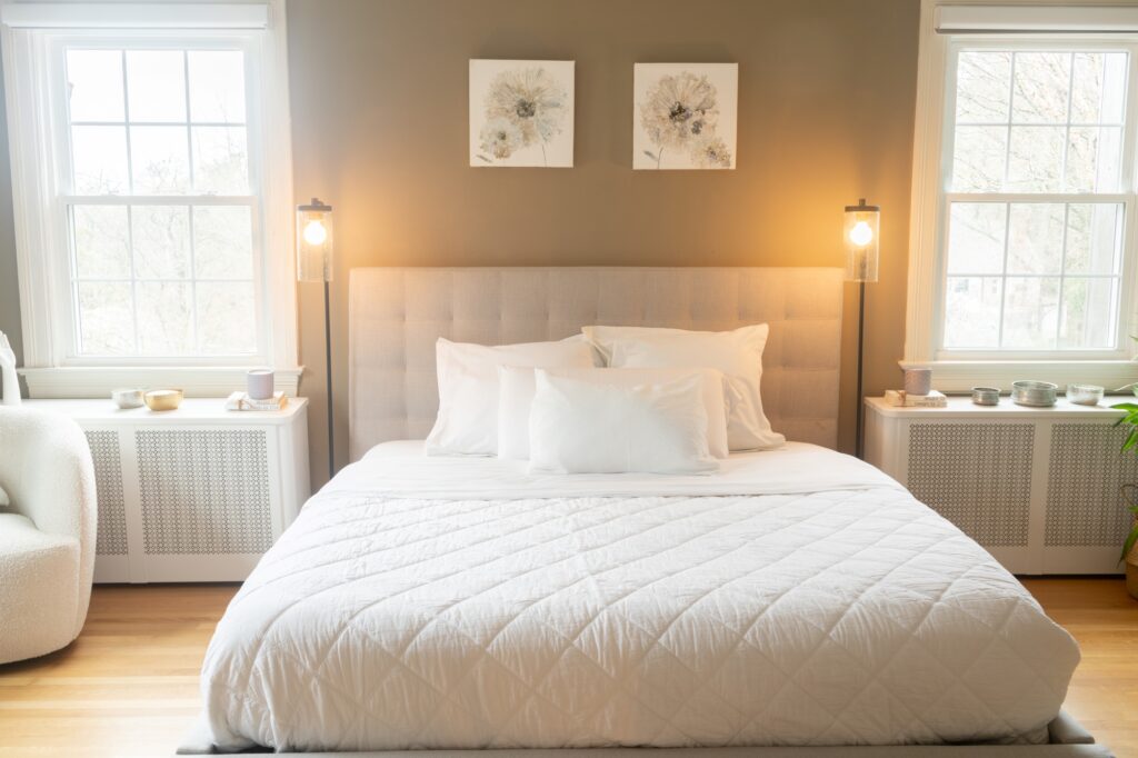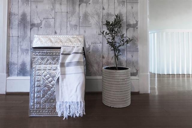 “My husband and I decided to paint all of our bedrooms, the master bathroom, and yes, our gym! The subtle gray color we picked really let the bright colors of Marilyn Monroe artwork pop, which we love a lot. We also used my favorite peach and aqua blue colors to create a cool pattern for our roman blinds.”